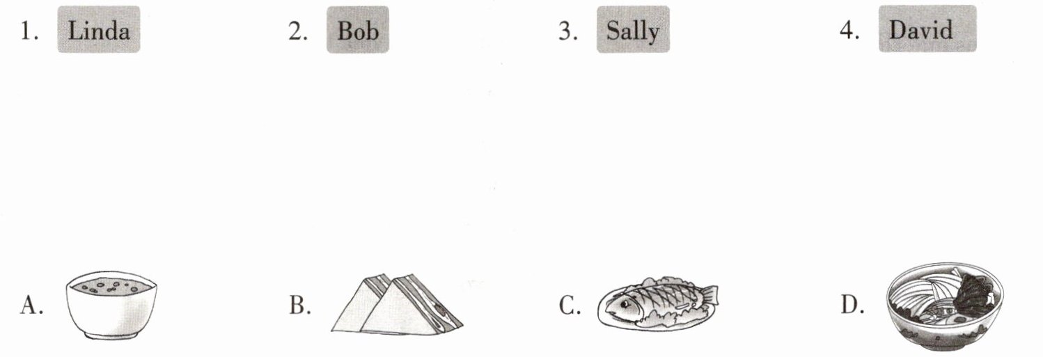 一、Listen and match. 学校餐厅今天有许多美味的食物。同学们正在谈论各自喜欢的食物。请你听一听,将人物与相应的图片连线。