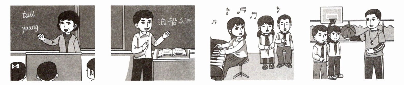 一、Listen and number. Wei Fang来到阳光学校参观。通过和同学们的交谈,她了解到了一些教师的信息。请你听一听,用数字1—4给下列图片排序吧。