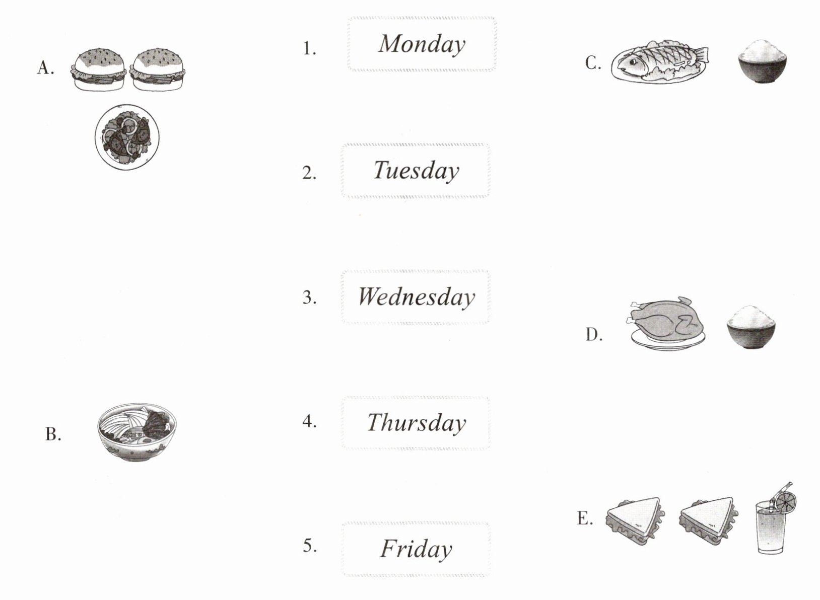 二、Listen and match. 阳光学校的教师 Miss Wu接待了Wei Fang,并为她介绍了学校一周的午餐状况。请你听一听,将时间与相应的图片连线。