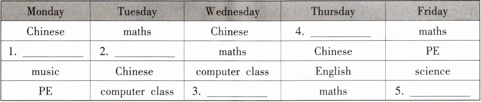 | PE | computer class | 3. ______ | maths | 5. ______ |
