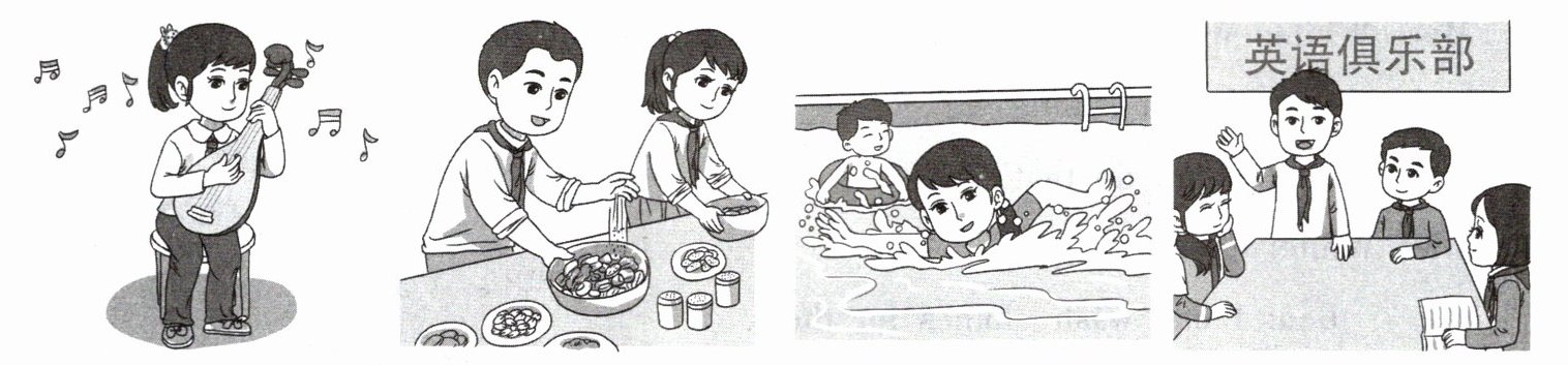 一、Listen and number. 学校的社团活动丰富多彩。Lele正在和朋友们谈论各自喜欢的社团活动。请你听一听,用数字1-4给下列图片排序吧。