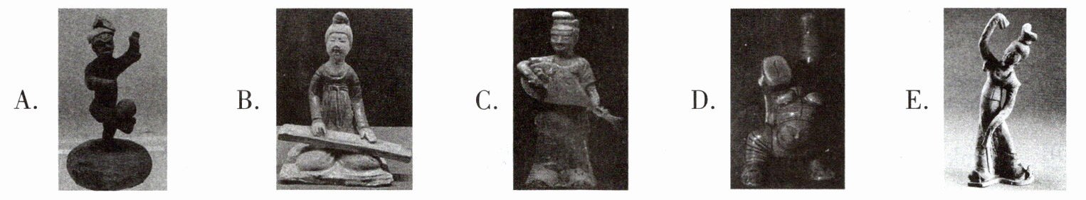 二、Look and choose. Feifei对陶俑特别感兴趣。她收集到了一些有趣的陶俑图片。请你看一看,为下列句子选择相应的图片。