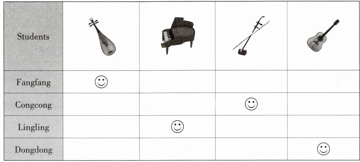 一、Look and write. 学校音乐社团里面的同学们分别会演奏哪种乐器呢?请你看一看,根据表格提示,在横线上填写适当的句子,完成对话。