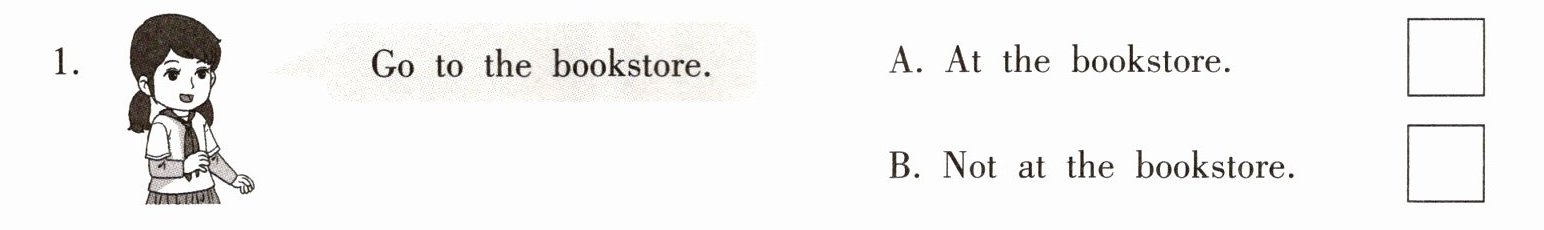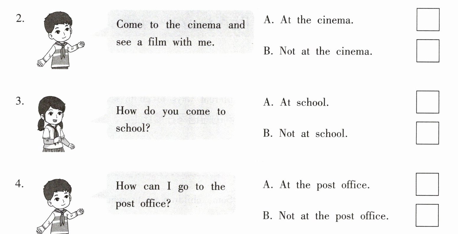 三、Read and tick. Lanlan和Jiejie在玩"猜位置"的游戏。请你根据他们说的话,在正确选项后面的方框内打"√"。
