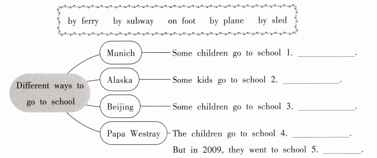 一、Think and choose. Lanlan正在制作"Different ways to go to school"这篇文章的思维导图。请你帮她回忆课文内容,选择正确的短语写在横线上。