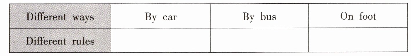二、Read and classify. 人们的出行方式不同,要遵守的交通规则也不同。Linda正在整理交通规则。请读一读,帮她分分类,将序号填在表格的相应位置。