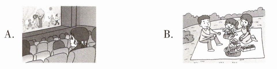 一、Listen and tick. 愉快的周末就要到来了,Alice和Lele打算去干什么呢?请听一听,在相应的图片下面画“√”。