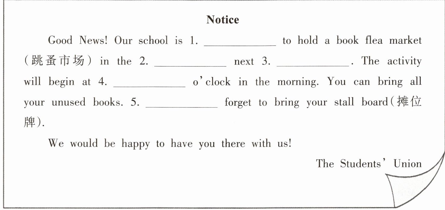 四、Read and fill. 学校将于下周一上午八点在操场举办图书跳蚤市场活动。请读一读,补全通知。