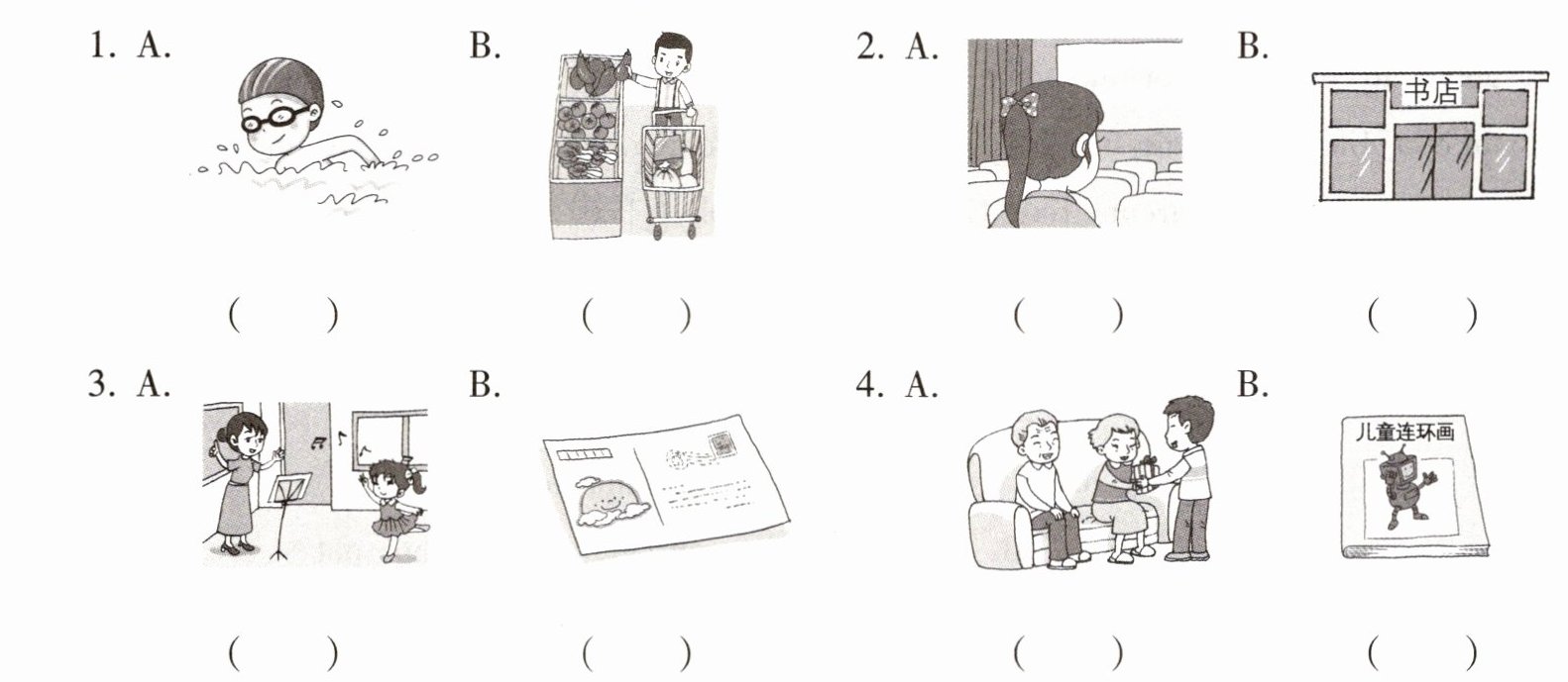 1. see a film 2. bookstore 3. dictionary 4. supermarket