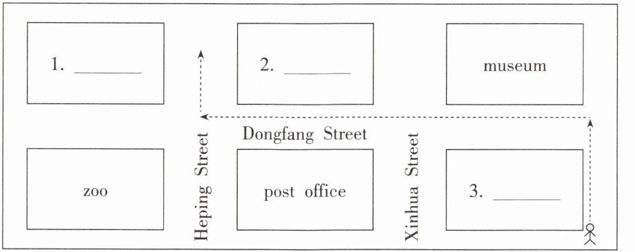 一、Listen and choose. Xinxin想找一家餐厅吃饭,但她不知道具体路线,于是她向路人求助。请听一听,选择相应的场所,并将其序号填在横线上。