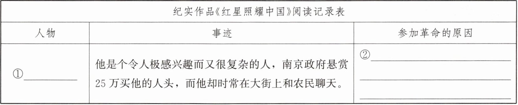 根据你对《红星照耀中国》的阅读积累,完成下面的表格。