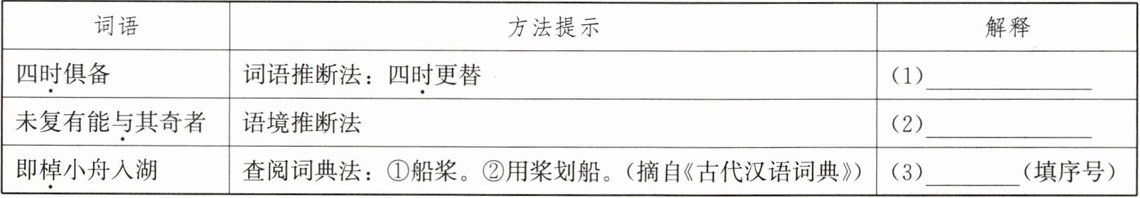 舟入湖|查阅词典法:①船桨。②用桨划船。(摘自《古代汉语词典》)|(3)______(填序号)|6. 把甲文中画横线的句子翻译成现代汉语。