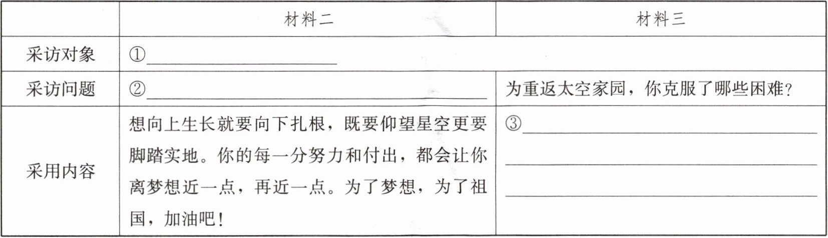 8. 材料二、材料三都有神舟十七号飞船指令长的采访报道,请联系两则新闻内容,完成下面表格。