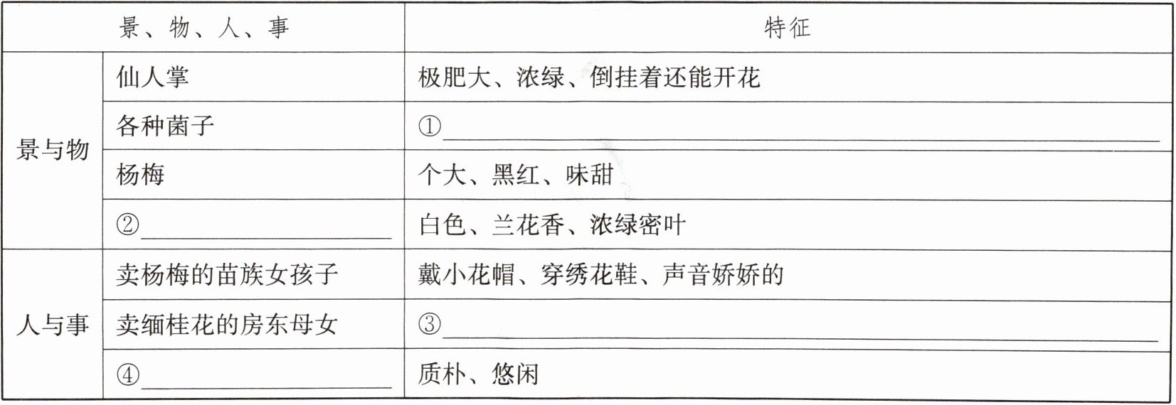 1. 根据课文勾画景、物、人、事的特点的句子,完成下表。