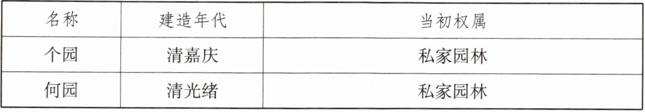 (1)示例 清代嘉庆年间建造的个园、光绪年间建造的何园,当初都是私家园林。