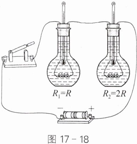 6. 在“探究电流通过导体产生的热量与电阻大小是否有关”的实验中,两阻值分别为$ R 和 2R $的电阻丝浸在质量和初温都相同的煤油中,每一烧瓶里各插入一支温度计,如图 17 - 18 所示。