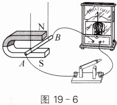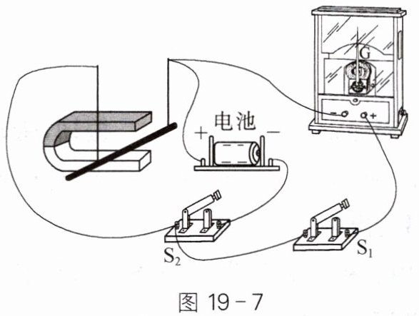 1. 图19-7所示的实验装置中,磁体和导体棒均水平放置。断开$S_2、$闭合$S_1,$使导体棒水平向右运动,灵敏电流计的指针向右偏转,这是