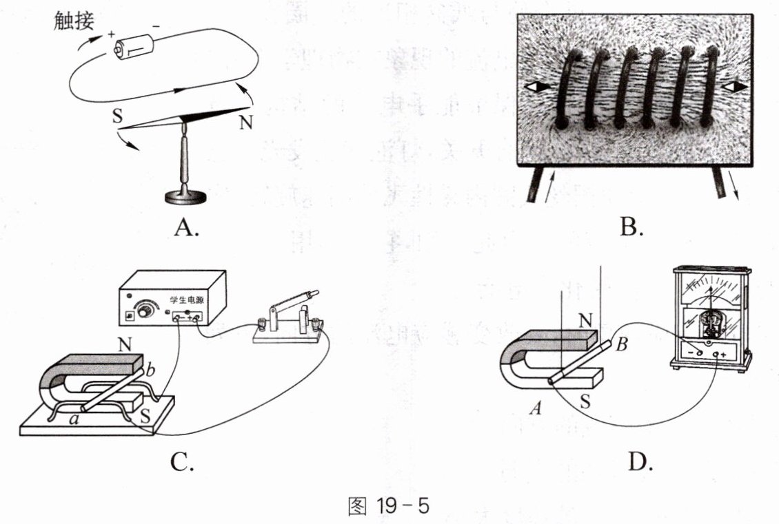 5. 共享电动汽车通过刷卡开锁,实现循环使用。租赁者将带有磁条的租车卡靠近电动汽车的感应器,检测头的线圈中就会产生变化的电流,读取解锁信息。图19-5中能反映刷卡读取信息原理的是(