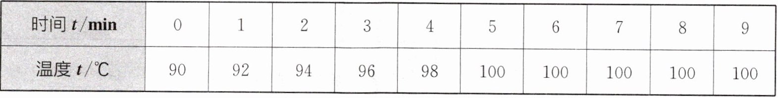 则是水沸腾时的情况。当水温升至$90^{\circ}C$时,每隔1min记录一次水温,5min后水开始沸腾,接着又观察、记录了4min,记录数据见下表:|时间$t/min$|0|1|2|3|4|5|6|7|8|9|