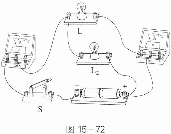 12. 某实验小组连接了如图15-72所示的电路,闭合开关$S$后,该组同学记录了两个电流表的示数分别是0.30 A和0.50 A,则通过小灯泡$L_{2}$的电流是