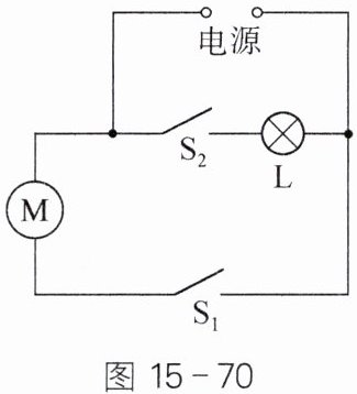 10. 图15-70是简化了的电冰箱的电路。图中$M$是压缩机的电动机,$L$是电冰箱内部的照明灯。当电冰箱接入电路后,关闭了电冰箱的门时,开关$S_{1}与S_{2}$的状态是