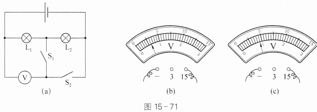 V;当$S_{1}$断开、$S_{2}$闭合时,灯$L_{1}$正常发光,电压表的示数如图15-71(c)所示,则此时灯$L_{2}$两端电压为1.5