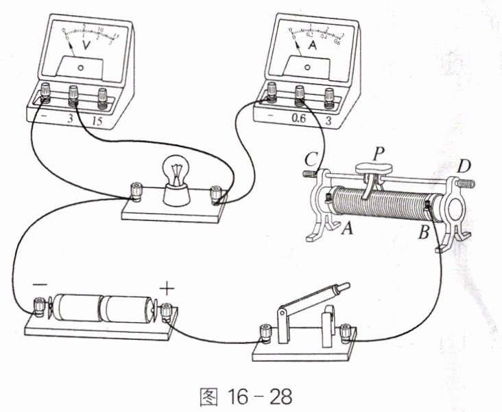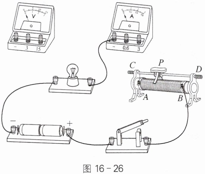 (3)中,闭合开关前,滑动变阻器连入的阻值应该最大,这样做的目的是为了保护电路,防止电路中电流过大,烧坏仪器。图16-26中,滑动变阻器的最大阻值端应该是A端。