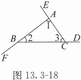 3. 如图 13.3 - 18,$\angle BAE$,$\angle CBF$,$\angle ACD$ 是 $\triangle ABC$ 的三个外角. 求证 $\angle BAE+\angle CBF+\angle ACD = 360^{\circ}$. 请把证明过程补充完整.