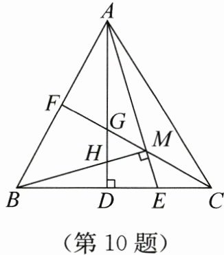10. 如图,$ AD $,$ CF $分别是$ \triangle ABC $的高和角平分线,$ AD $与$ CF $相交于点$ G $,$ AE $平分$ \angle CAD $交$ BC $于点$ E $,交$ CF $于点$ M $,连接$ BM $交$ AD $于点$ H $,且$ BM \perp AE $. 则下列结论正确的有(