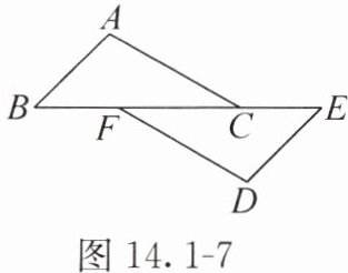 9. 如图14.1-7,已知△ABC≌△DEF,∠B和∠E是对应角,点A和点D是对应顶点,BC= 5 cm,CE= 2 cm,∠B= 45°,∠ACB= 30°. 求线段FC的长和∠D的度数.