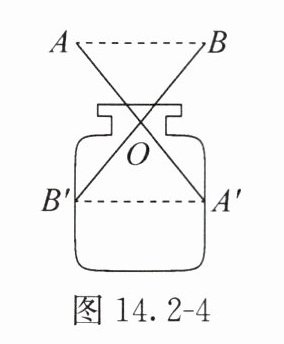 4. 如图14.2 - 4,AA',BB'表示两根长度相同的木条. 若O是AA',BB'的中点,经测量AB = 11 cm,则容器的内径A'B'为(