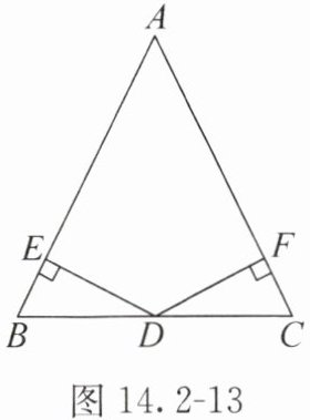 2. 如图14.2 - 13,在$△ABC$中,$∠B = ∠C$,$D为BC$的中点,过点$D分别向AB$,$AC$作垂线,垂足分别为$E$,$F$,则能直接判定$△BDE ≌ △CDF$的依据是(