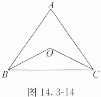 3. 如图14.3-14,在△ABC中,O是△ABC内一点,且点O到△ABC三边的距离相等,∠BOC= 126°,则∠A的度数为(
