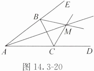 9. 如图14.3-20,在△ABC中,AB<AC,∠BAC的平分线与外角∠BCD的平分线相交于点M,作AB的延长线得到射线AE,再作射线BM. 下面有四个结论: