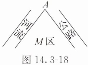 7. 如图14.3-18,要在M区建一个工厂,使工厂到河流和公路的距离相等,并且到河流与公路交叉点A处的距离为1 cm(指图上距离),则应将工厂建在哪里?画图并说明理由.