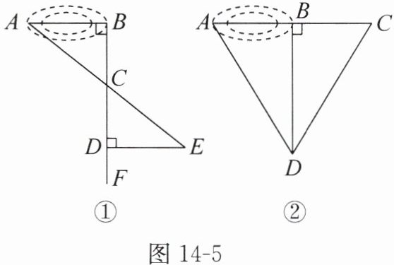 方案Ⅰ:如图 14-5①,先过点$B作BF\perp AB$,再在$BF上取C$,$D$两点,使$BC = CD$,接着过点$D作BD的垂线DE$,交$AC的延长线于点E$,则测量$DE$的长即可;