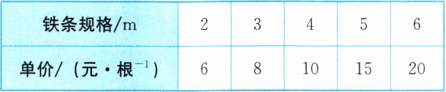 ∴可以购买4 m长的铁条3根,3 m和5 m长的铁条各一根,费用最少,最少费用为10×3+8+15=53(元).答:购买铁条最少需要53元.