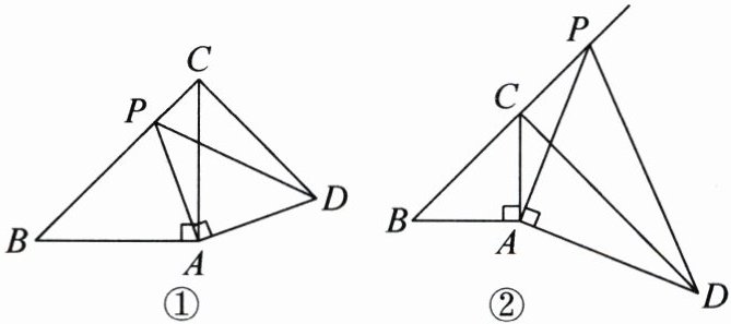 (2)如图②,当点 $ P $ 在线段 $ BC $ 的延长线上时,请直接写出线段 $ BP $ 和 $ CD $ 的数量关系与位置关系.