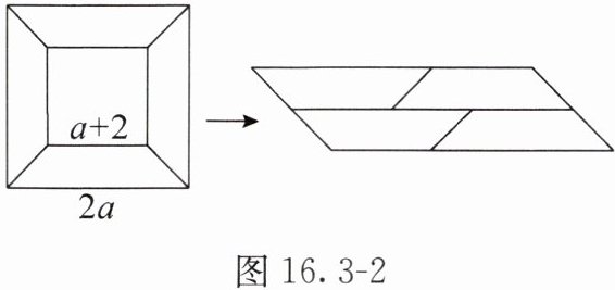 5. 如图16.3-2,在边长为$2a的正方形中央剪去一边长为a + 2的小正方形(a > 2)$,将剩余部分剪开拼成一个平行四边形(不重叠无缝隙),则该平行四边形的面积为(