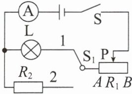 将S₁接2,滑片移至A端时,只有电阻为R₂的定值电阻接入电路,电路总功率P₂=UI。