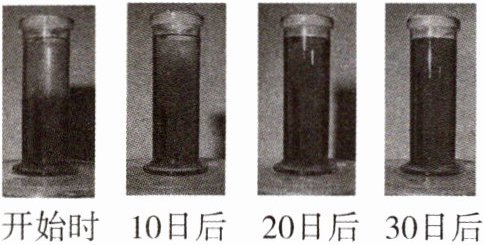 如图所示,在玻璃筒里装一半清水,用细管在水的下面注入硫酸铜的水溶液。静放几天,你会观察到