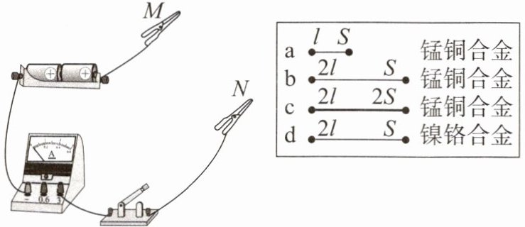 为了验证猜想是否正确,老师提供的器材如图所示,实验板上固定了a、b、c、d四根金属丝,a、b、c为锰铜合金丝,d为镍铬合金丝,S表示合金丝的横截面积,l表示合金丝的长度。实验时,将金属丝分别接入电路中的M、N两点之间。