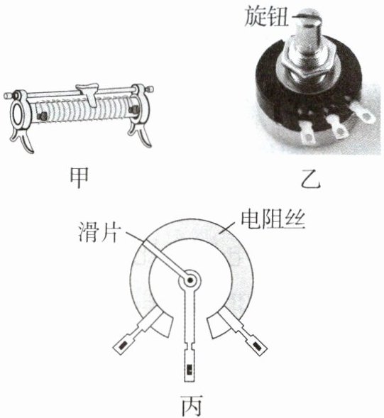 ,其中有一种是学生实验室中常用的滑动变阻器,如图甲所示;还有一种是如图乙所示的电位器,其内部结构如图丙所示。它们都是通过改变接入电路中的电阻丝的长度