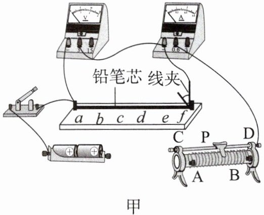 10. 某小组想探究导体的电阻与导体长度的关系。他们选择了如图甲所示的器材,并连接了部分电路。将固定在木板上的长为$15cm$的铅笔芯作为研究对象,并标记为等长的五段,$a$、$f$为铅笔芯的两个端点,中间四点分别标记为$b$、$c$、$d$、$e$。