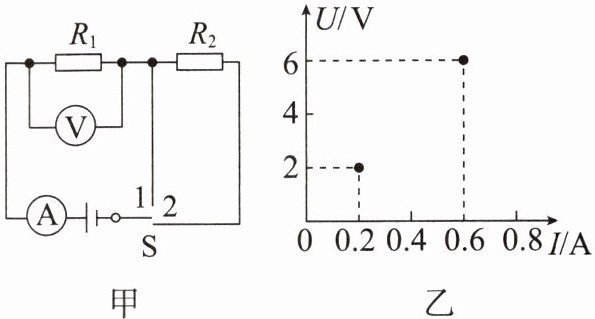2.解(1)由题图甲可知,当开关S接1时,该电路为只含有电阻为$R_{1}$的电阻器的简单电路,电流表测电路中的电流,电压表测它两端的电压,即电源电压。此时电路的总电阻最小,由$I=\frac{U}{R}$可知电路中的电流最大。由题图乙可知最大电流$I_{大}=0.6\ A$,对应的电压表示数为$6\ V$,即电源电压$U=6\ V$。