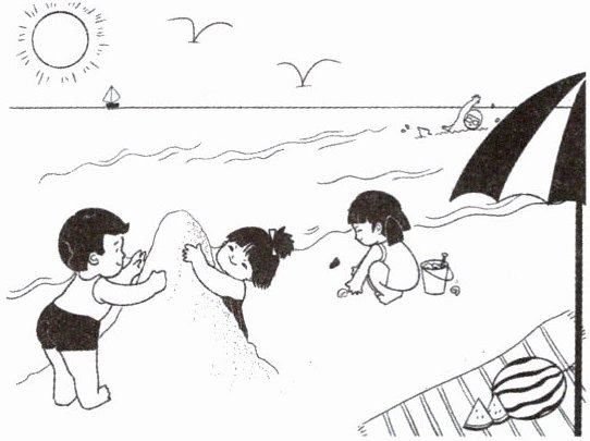 九 炎热的暑假里,小朋友最喜欢到海边去度假。请你仔细观察图画,看看图上都有谁,他们在做什么。围绕第一句话的意思,写出小朋友们的快乐来吧!