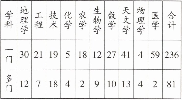《中国古代科学家传记》记录了 19 世纪以前 236 位中国籍科学家,其学科分布情况如下表:
