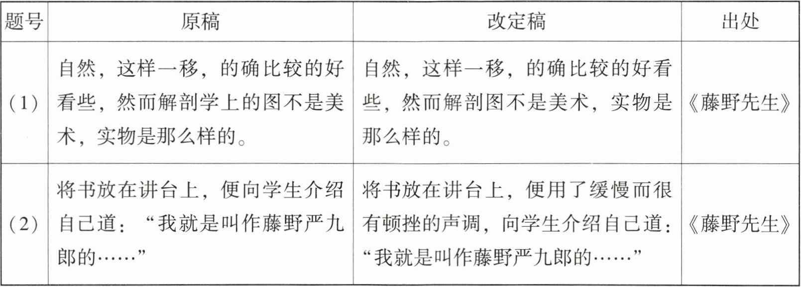 2. 鲁迅先生是修改文章的典范。比较下面的原稿和改定稿,谈谈这些修改好在哪里。