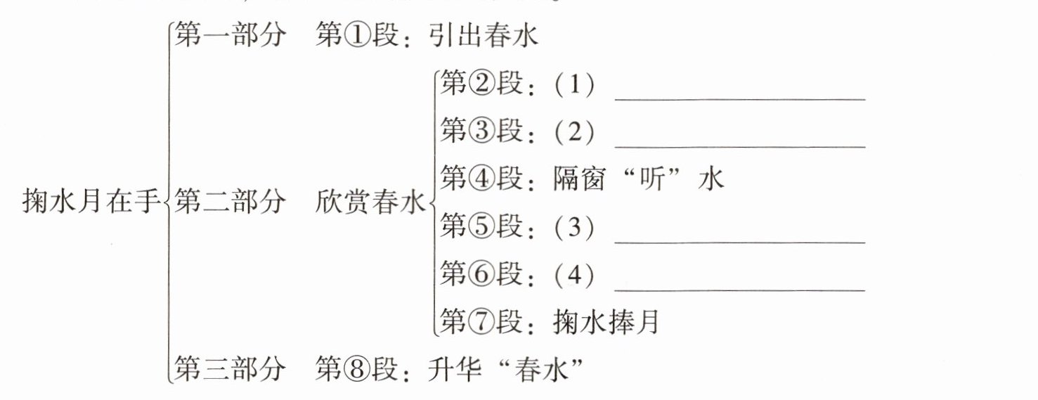 13.(1)小河夏秋冬 (2)傍晚启程 (3)暮色水声 (4)河面月影 14.不能删,“仿佛”有“似乎”“好像”之意,这里写的是“我”的想象,并非真正听到河水的声音。“我”想象春天河水那潺潺的流水声,希望享受一场听觉盛宴,表达出“我”对春水的渴望之情。 15.画线句连用四个拟声词,从听觉上写出了春水流淌的美妙声音,并且写出了春水不同的动态美,表达出“我”对春水的无比喜爱之情;四个叠词排列,句式整齐又有节奏感,富有音韵美。 16.①“掬水月在手”意思是伸手将水捧于手心,希望能将月的影子映在手中;②月亮并不一定能真正掬于手心,或许这只是一种想象,表达出“我”想融于自然,与自然亲密接触的美好愿望;③营造了静谧而美好的意境,给人以丰富的联想和想象,富有诗意浪漫之美。