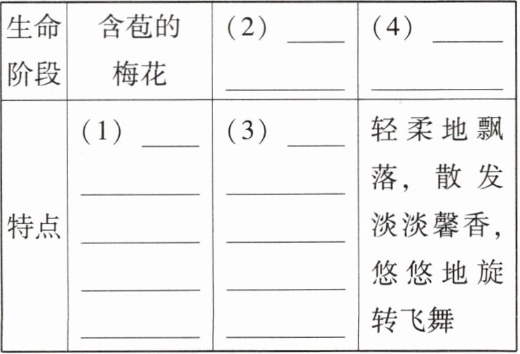 12. 文中不同生命阶段的梅花呈现了不同的特点,请结合⑤、⑥段内容填写下表。